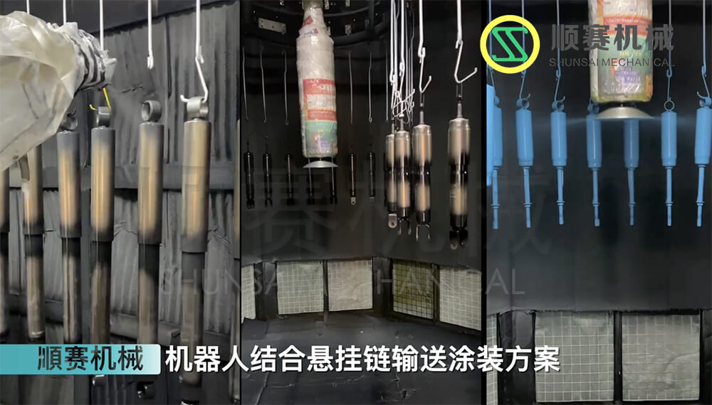 傳統(tǒng)的噴涂工藝中,無論是使用懸掛鏈還是地軌的方案,通常噴涂人員會使用手動噴槍預(yù)先對復(fù)雜結(jié)的構(gòu)減震器各個死角進(jìn)行預(yù)噴涂,以避免出現(xiàn)產(chǎn)品露底的品質(zhì)異常。在確保每個產(chǎn)品關(guān)鍵位置補(bǔ)噴到位的情況下,自動化系統(tǒng)將產(chǎn)品送入歐米茄靜電旋碟完成整體的表面涂裝。在這個過程中,需要充分保證人工的作業(yè)效率與線體的節(jié)拍時間相匹配。而在實(shí)際的作業(yè)情況中,即使作業(yè)人員的長時間高負(fù)荷的進(jìn)行預(yù)噴涂的工作,往往也不能達(dá)到后端靜電旋碟的處理效率,造成整體線體產(chǎn)能受限的問題。同時高頻次重復(fù)性的人工作業(yè),會使人員極度疲憊,造成噴涂質(zhì)量下降的,出現(xiàn)涂裝質(zhì)量異常的狀況。